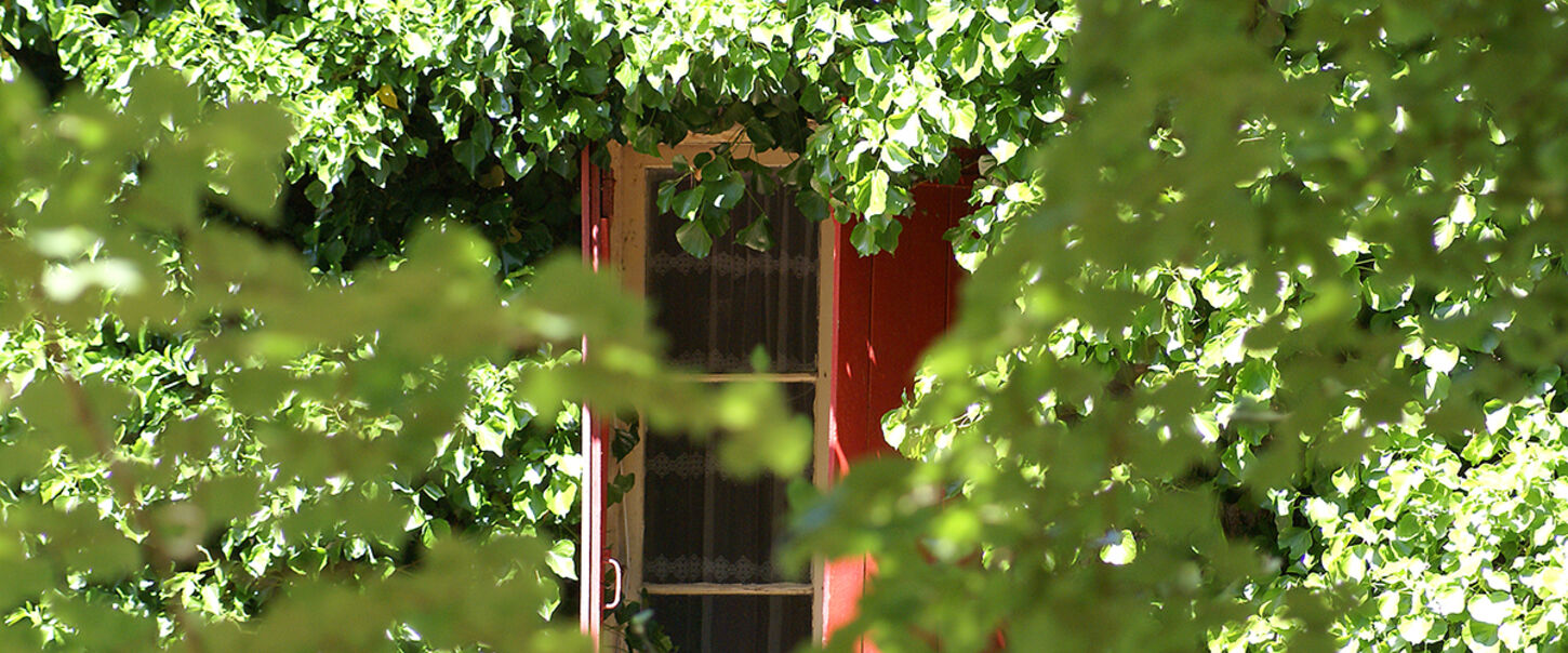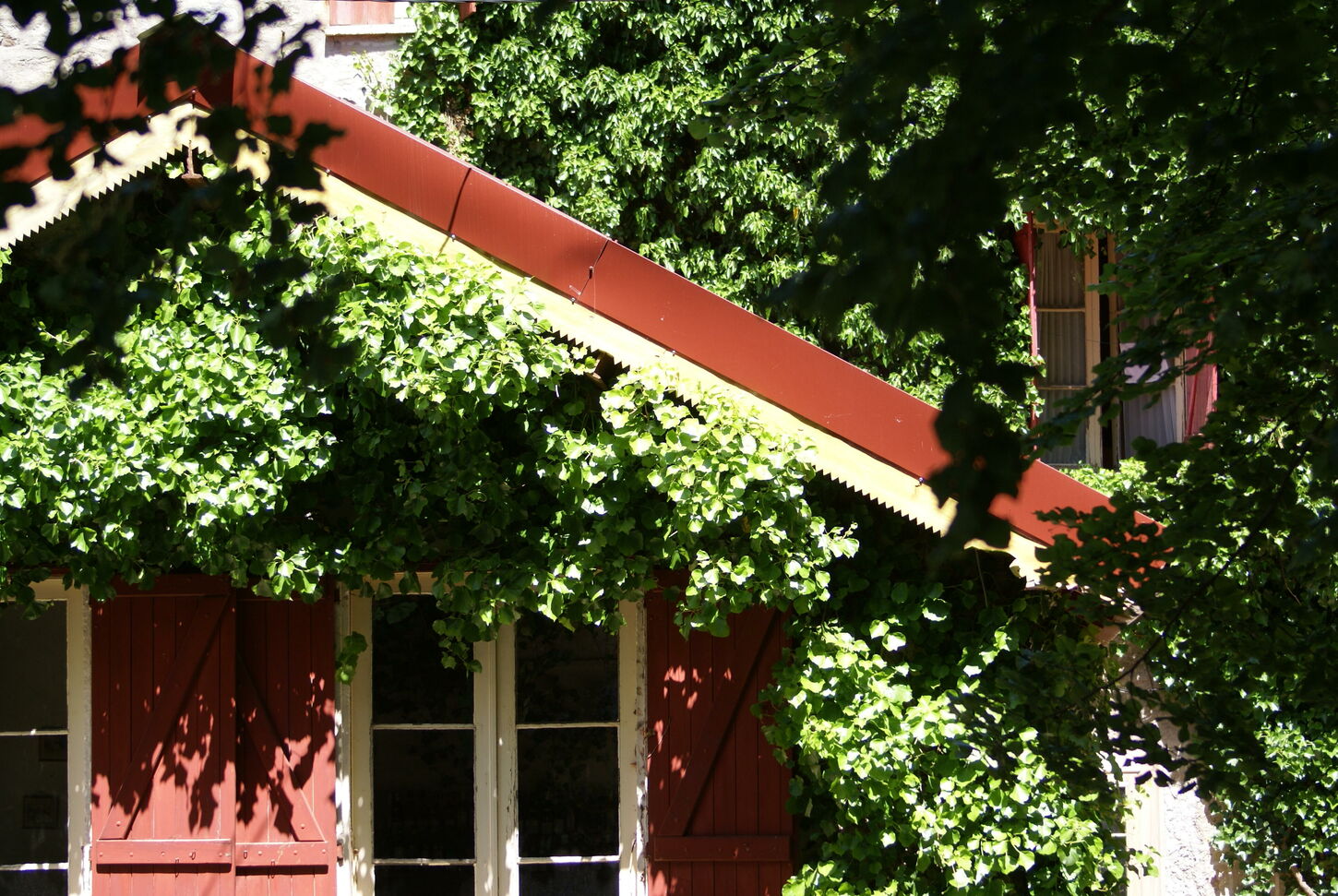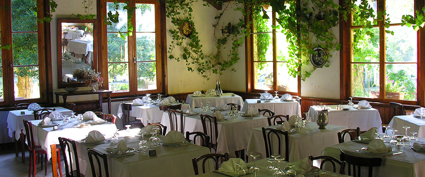 Cette Salle à manger restitue l’ambiance d’un hôtel de villégiature de la fin du 19ème siècle. La présence du bois, l’importance des vitrages ouvrant la pièce sur la nature, le lierre qui court sur les murs et le plafond, les chaises en bois tourné, les nappes blanches, les couverts en argent, tout participe au maintien du caractère du lieu.